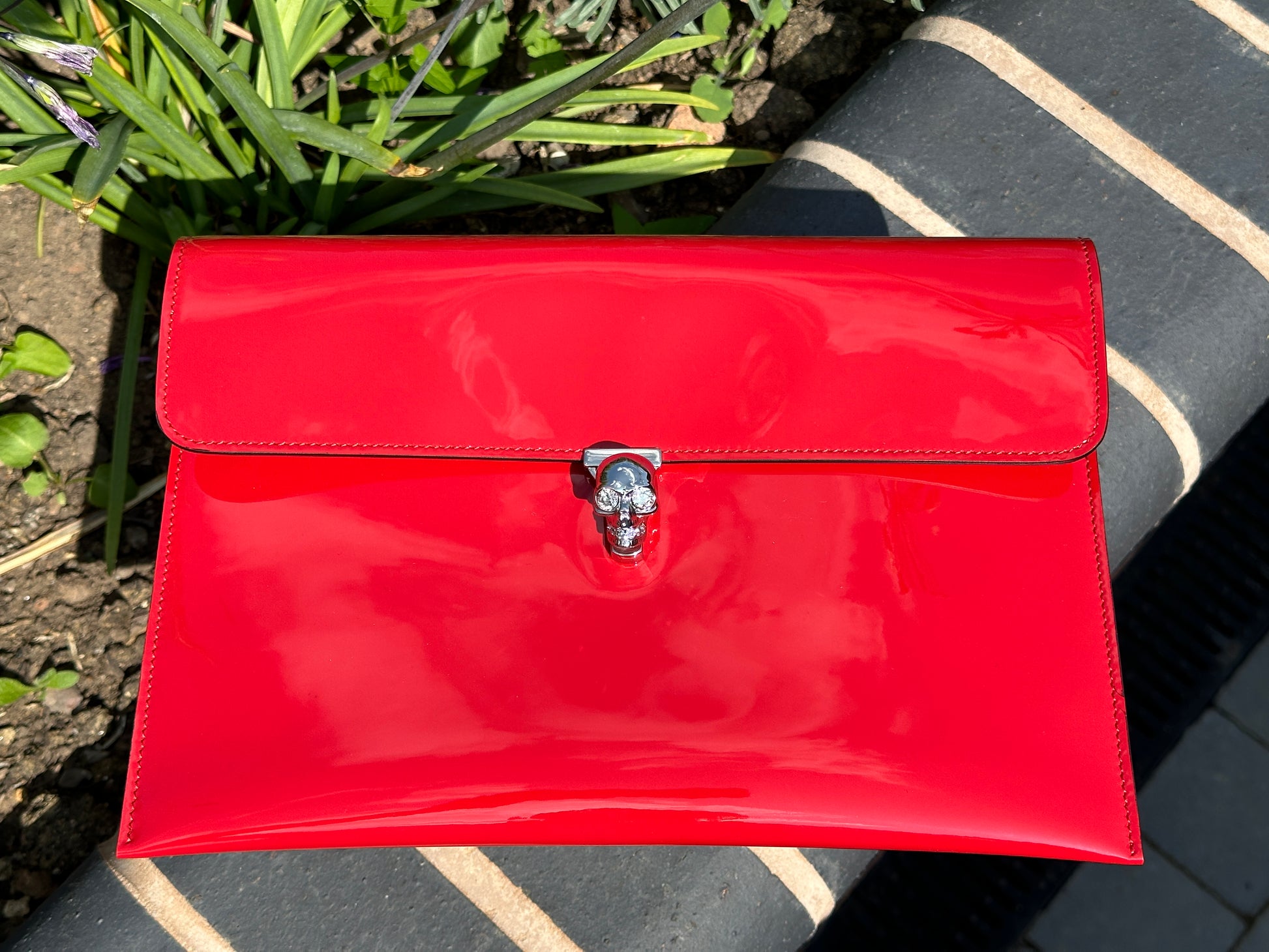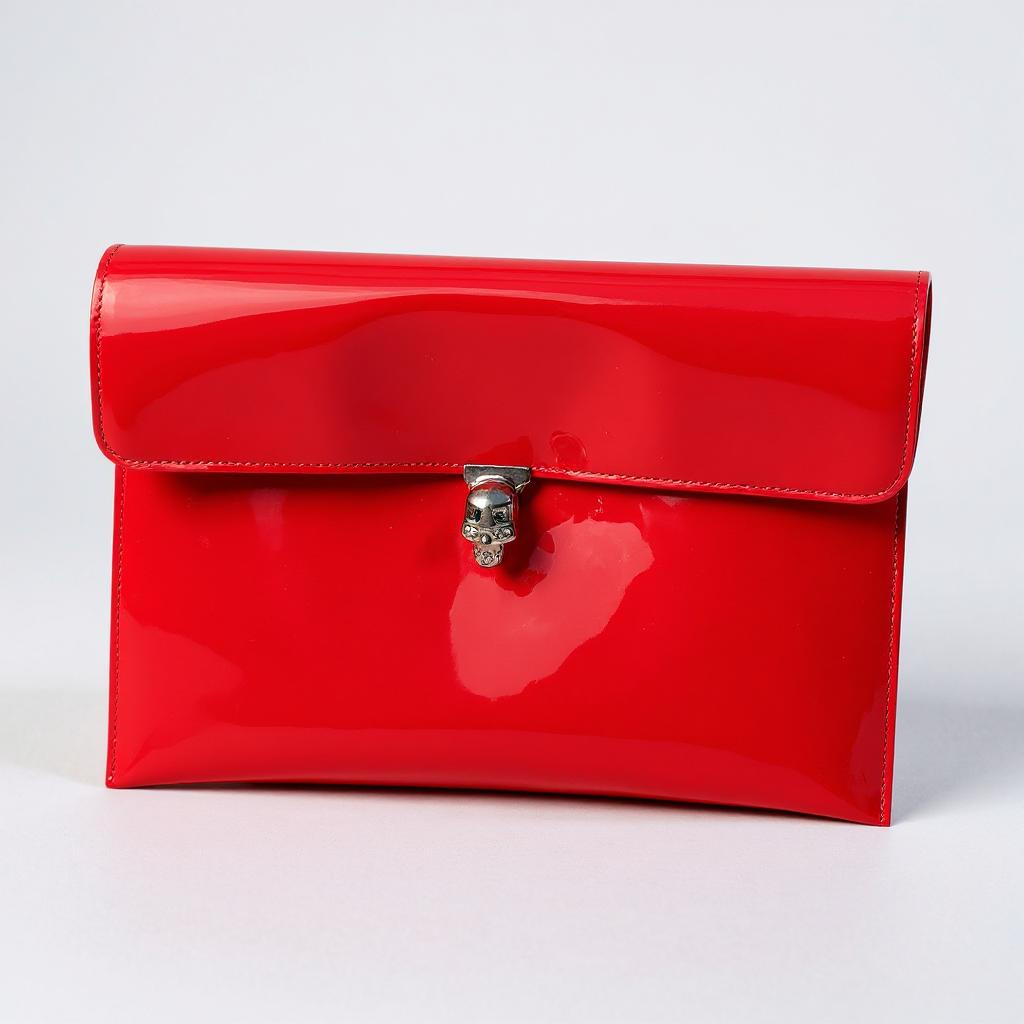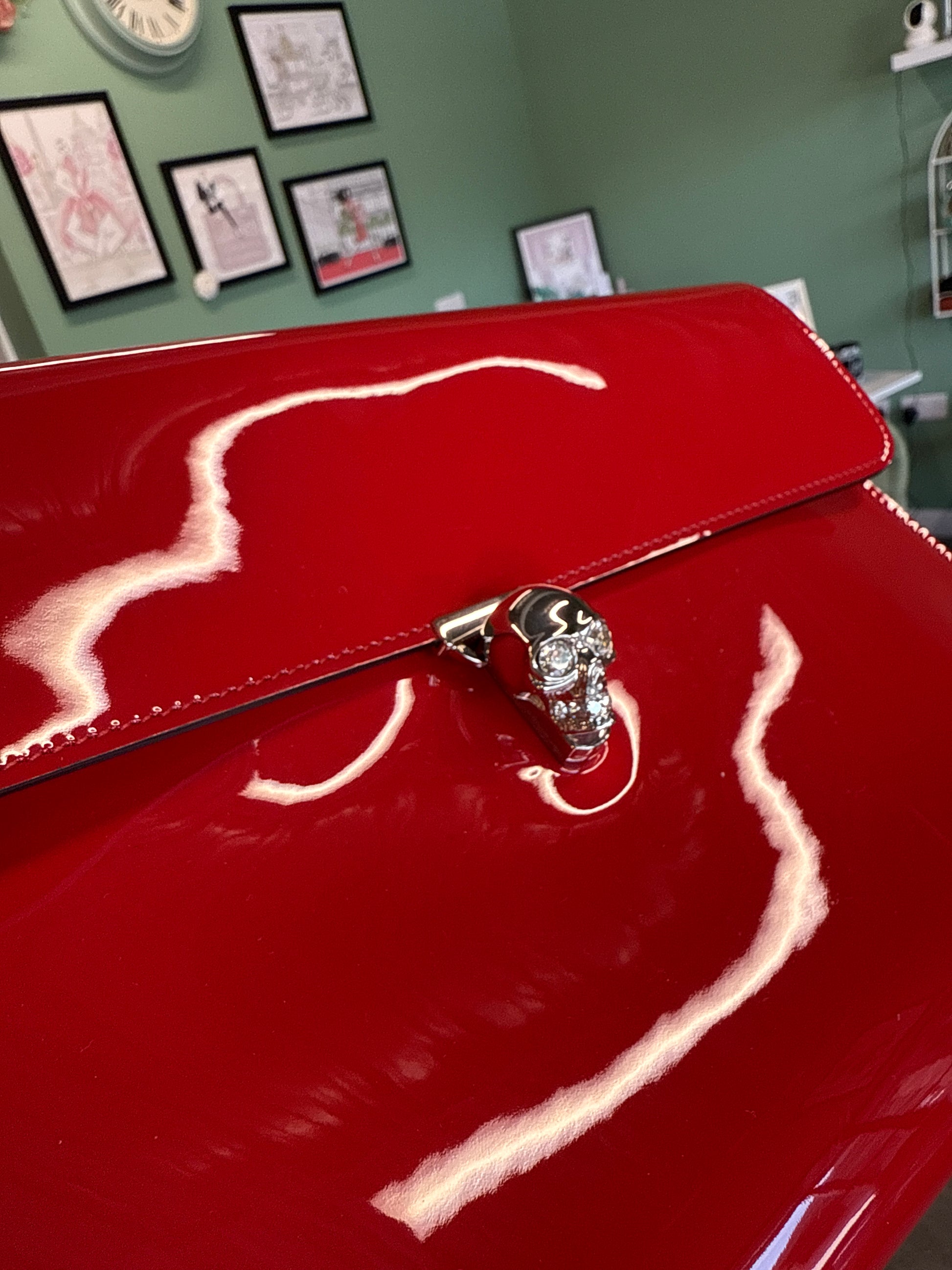 Alexander McQueen clutch in glossy red patent leather, featuring the signature silver-tone skull clasp closure. This striking piece is in great preloved condition, showing minimal signs of gentle use. Comes complete with its original box.
