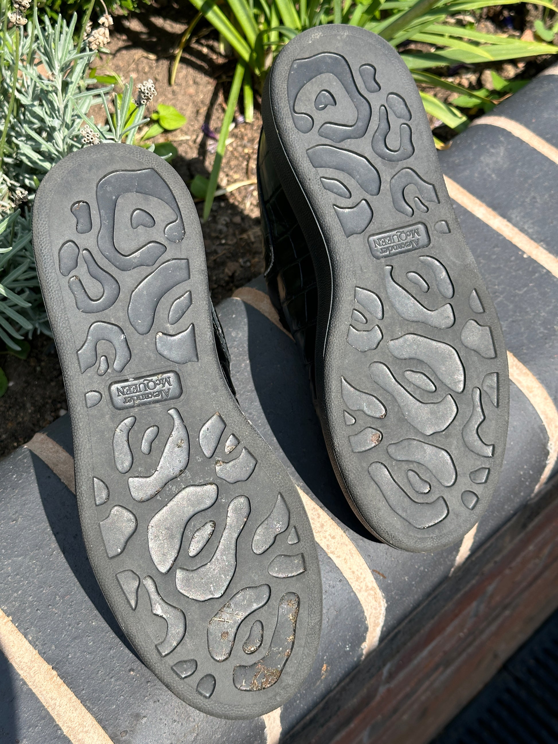 Alexander McQueen low-top trainers in black croc-embossed leather, featuring tonal laces, a chunky sole, and subtle silver-tone logo detailing on the tongue. Sized UK 5, these trainers are in good condition with light signs of wear.