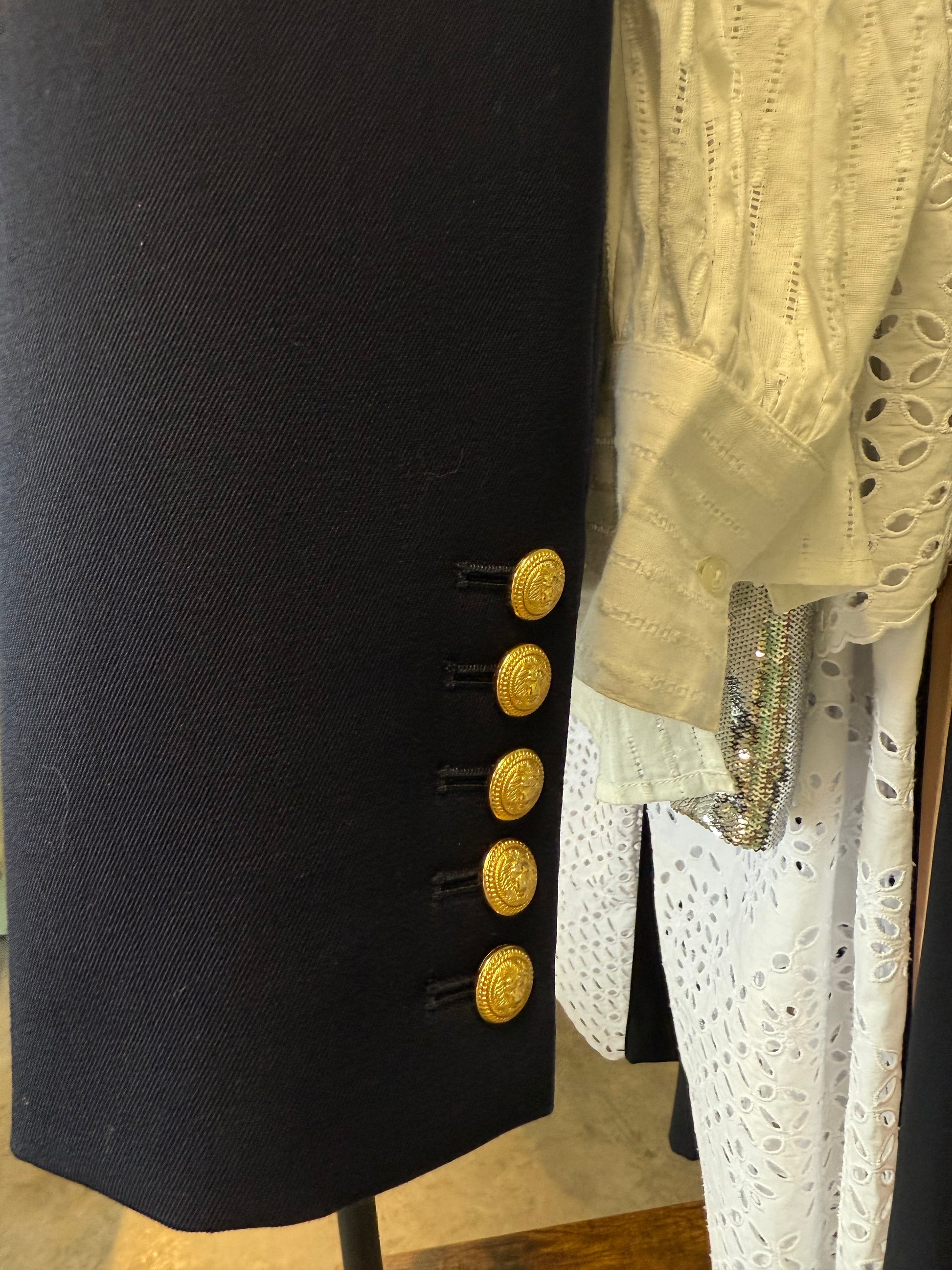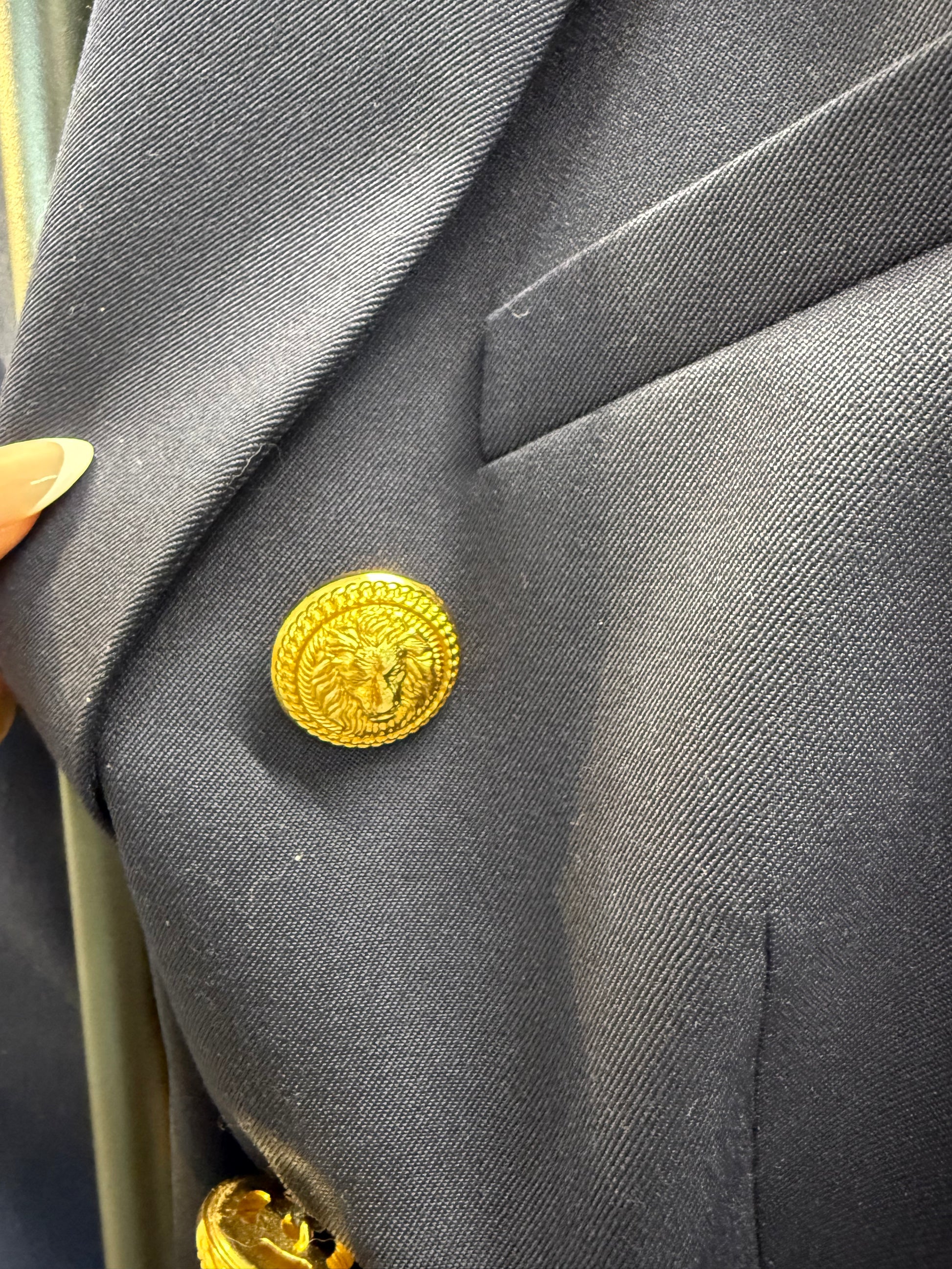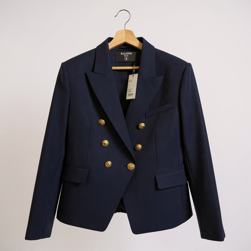 Elevate your wardrobe with this timeless Balmain blazer, crafted in a structured navy fabric for a sleek, tailored silhouette. Featuring the brand’s signature double-breasted design with six ornate gold-tone lion-embossed buttons, this piece is the epitome of Parisian chic. Finished with peak lapels, flap pockets, and sharp tailoring, it embodies Balmain’s iconic power-dressing aesthetic.