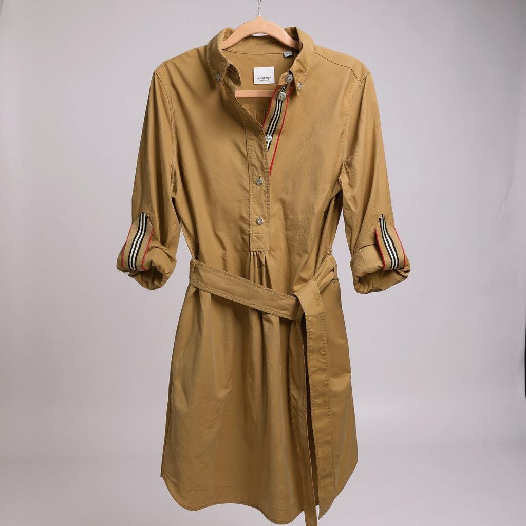 Burberry shirt dress in UK10, crafted in a warm camel tone. Features a partial button placket, pointed collar, and roll-tab sleeves lined with the brand’s iconic check pattern for a signature touch. Finished with a matching self-tie belt to cinch the waist and create a flattering silhouette. Excellent preloved condition.