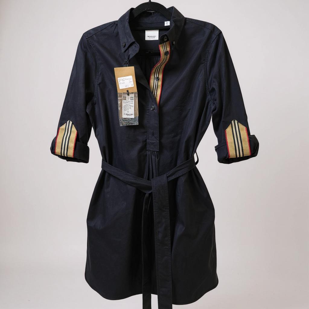 Burberry shirt dress in UK10, crafted in black tone. Features a partial button placket, pointed collar, and roll-tab sleeves detailed with the brand’s iconic check pattern for a signature accent. Designed with a matching self-tie belt to cinch the waist and create a flattering silhouette. Comes with original tags attached, indicating unused condition.