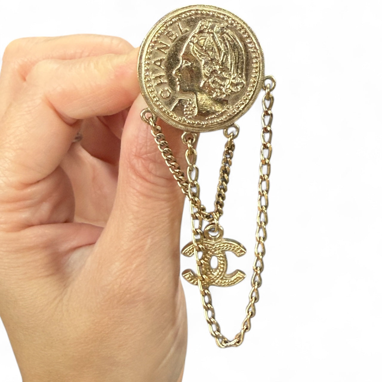 A striking vintage Chanel brooch crafted in gold-tone metal, featuring a detailed coin medallion embossed with the Chanel name and classical profile motif. Suspended from the coin are two draped chains, one adorned with the iconic interlocking CC logo charm. This collectible piece captures the timeless elegance and bold design aesthetic of Chanel’s early 1990s costume jewellery.