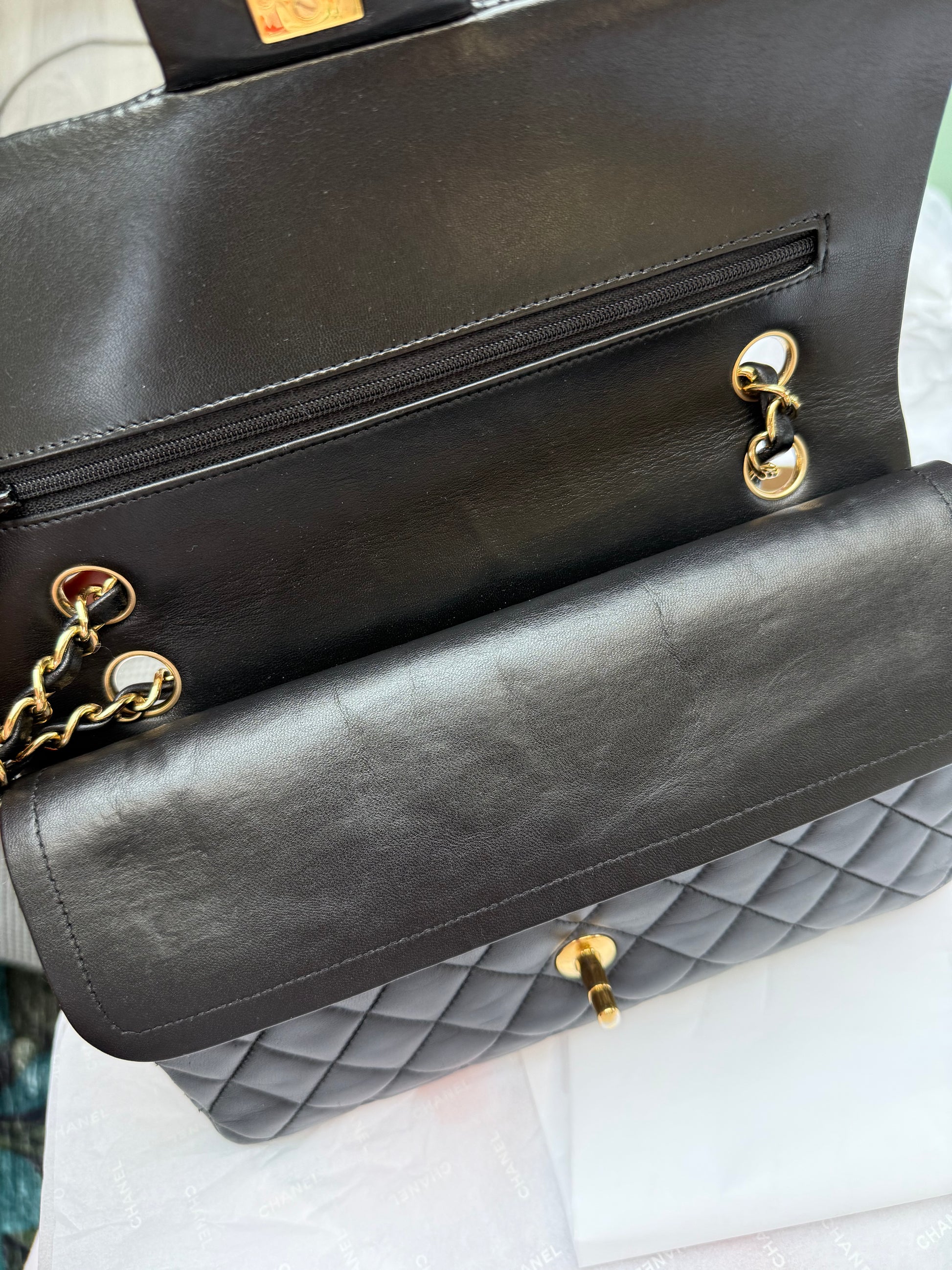 Chanel Classic Flap Bag in excellent preloved condition, recently refreshed by Chanel at Harrods — she’s just had the ultimate full spa treatment! Crafted from luxurious black quilted lambskin leather, this timeless piece features the iconic gold-tone CC turn-lock closure and leather-interwoven chain strap. The refurbishment has left the leather supple, the quilting plump, and the hardware gleaming, making her look almost new while retaining her classic charm. A truly investment-worthy piece for any Chanel lover.