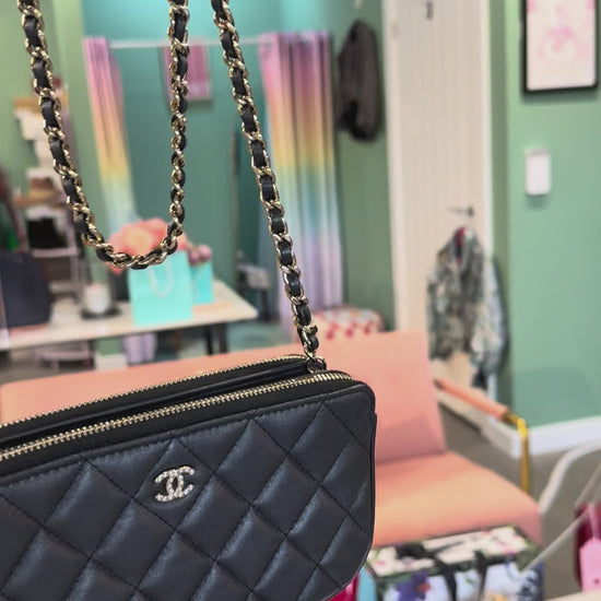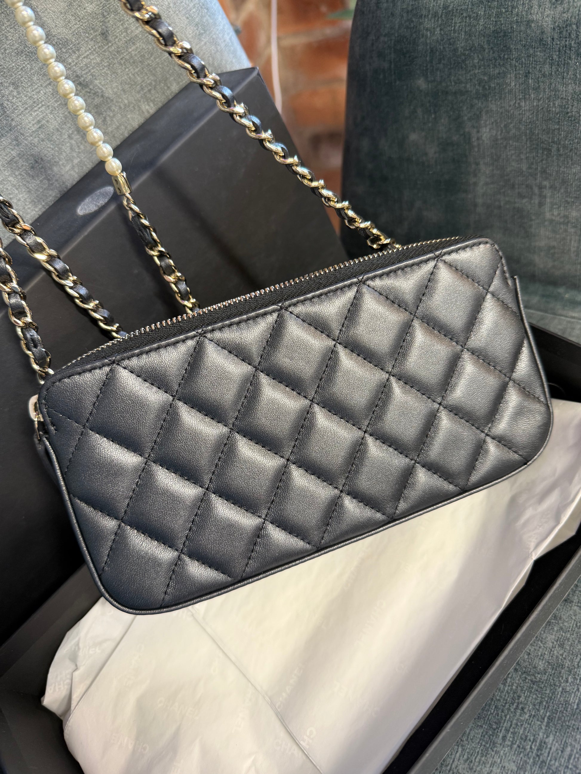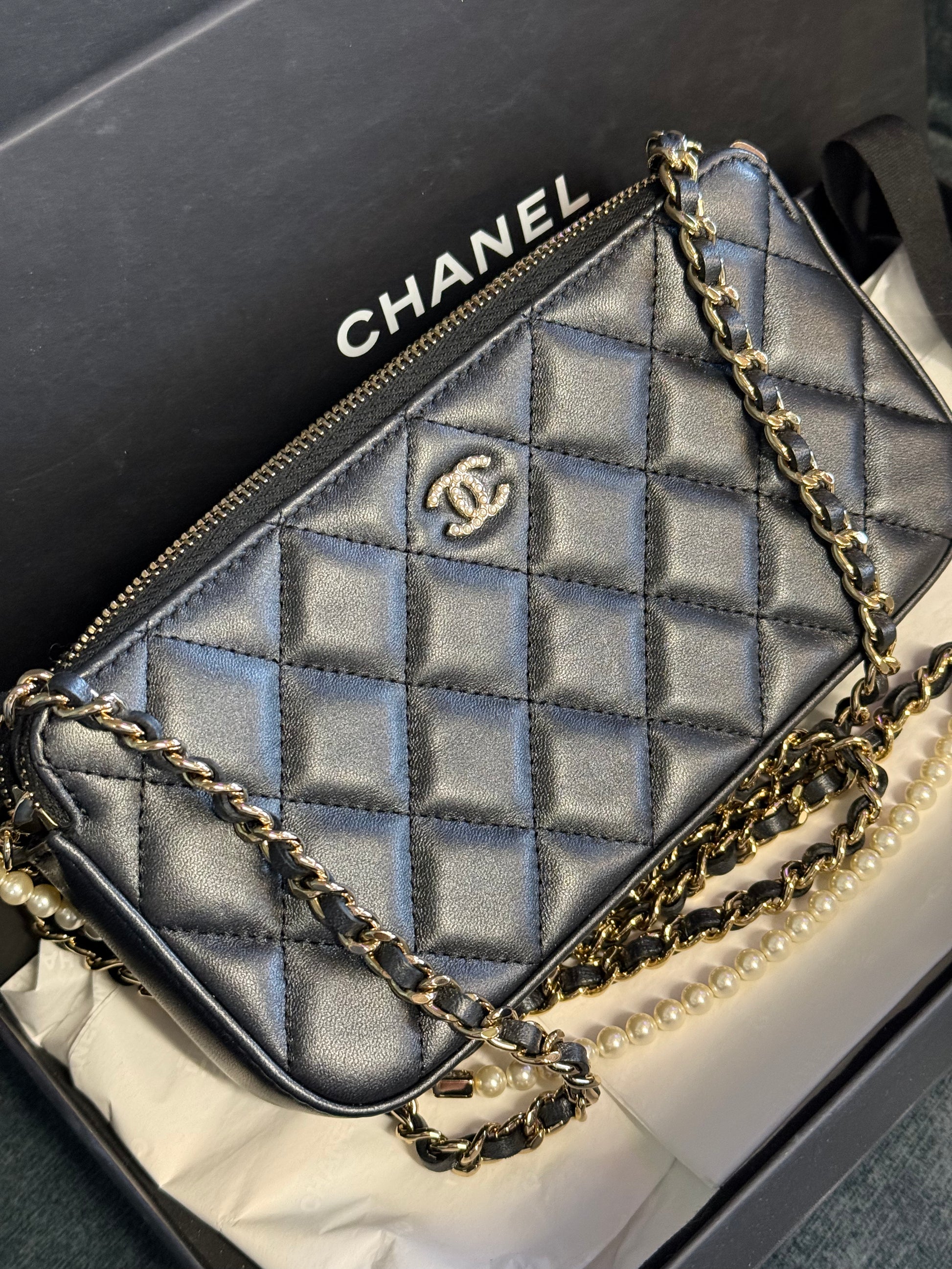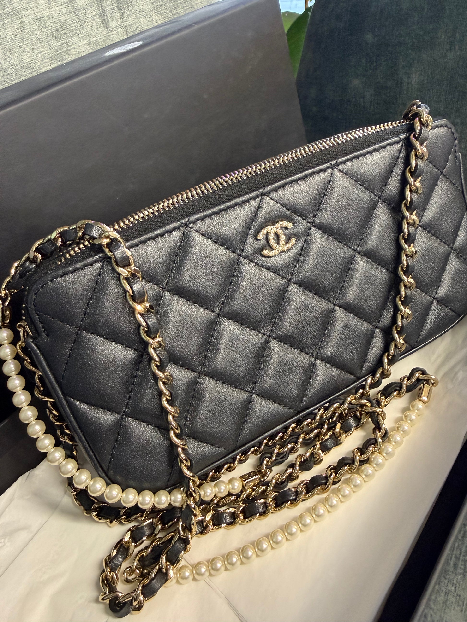 Chanel Quilted Leather Pouch on Chain – Black with Pearl Detail