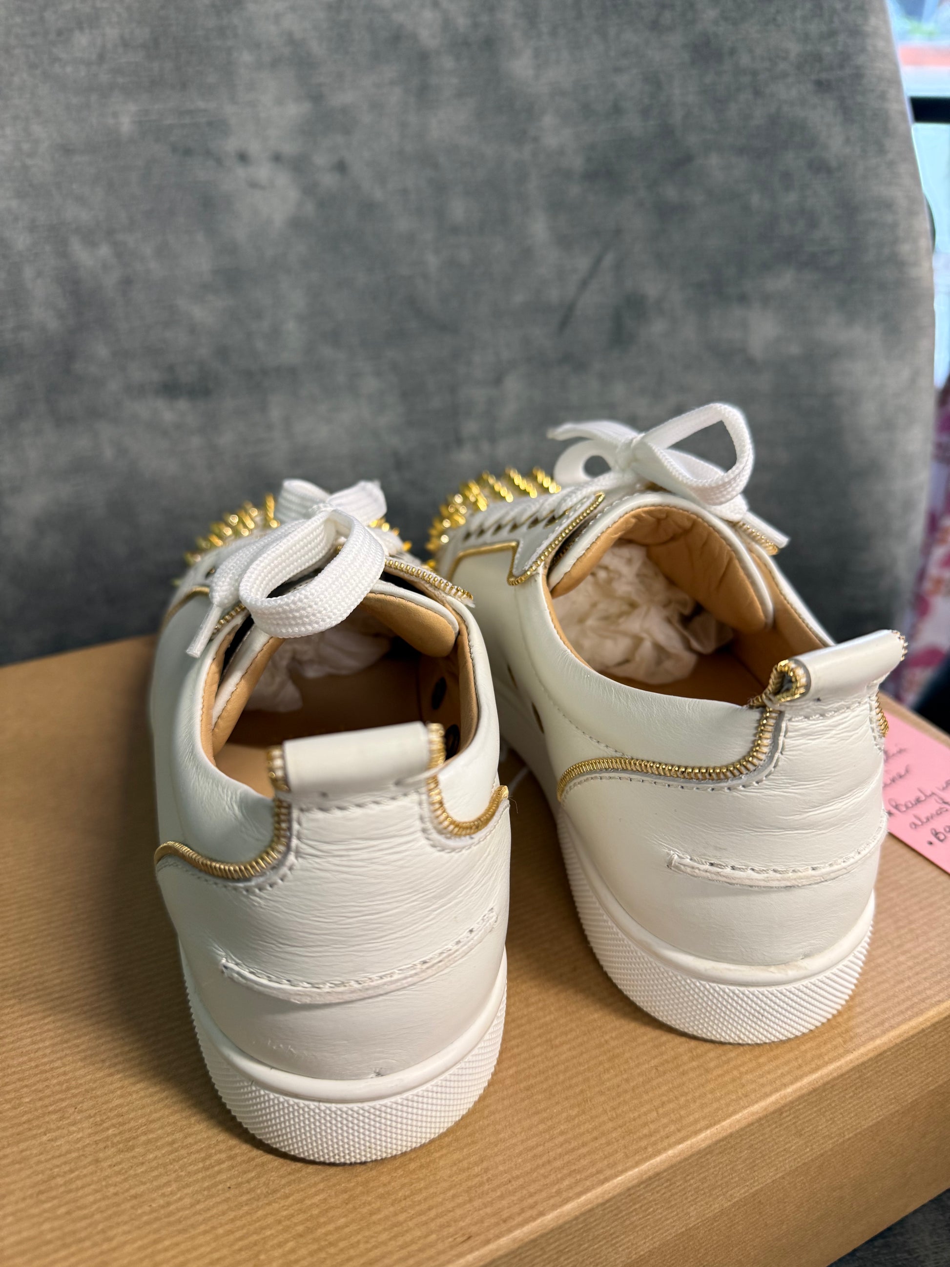 A statement take on everyday luxury, these Christian Louboutin Louis Spikes sneakers are crafted in smooth white leather and finished with the brand’s iconic signature gold spike embellishment across the toe. Gold-tone zip detailing and eyelets add an elevated edge, while the classic low-top silhouette keeps them effortlessly wearable.