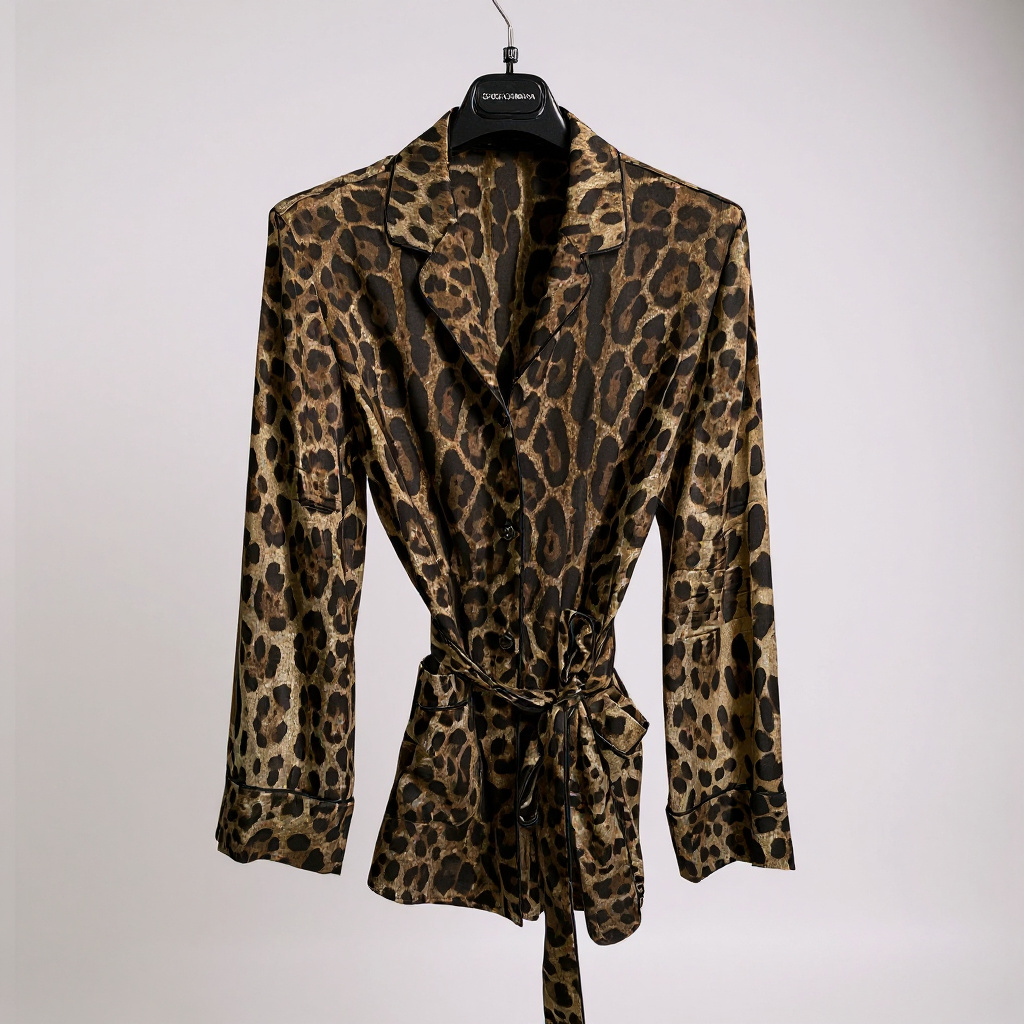 This Dolce & Gabbana jacket in UK38 is a luxurious satin piece featuring the brand’s signature leopard print in rich brown and black tones. Designed with a relaxed, pyjama-inspired silhouette, it has a notched collar, button-down front, and a matching self-tie belt to cinch the waist. The long sleeves and piped edges add to its refined yet effortlessly glamorous appeal.