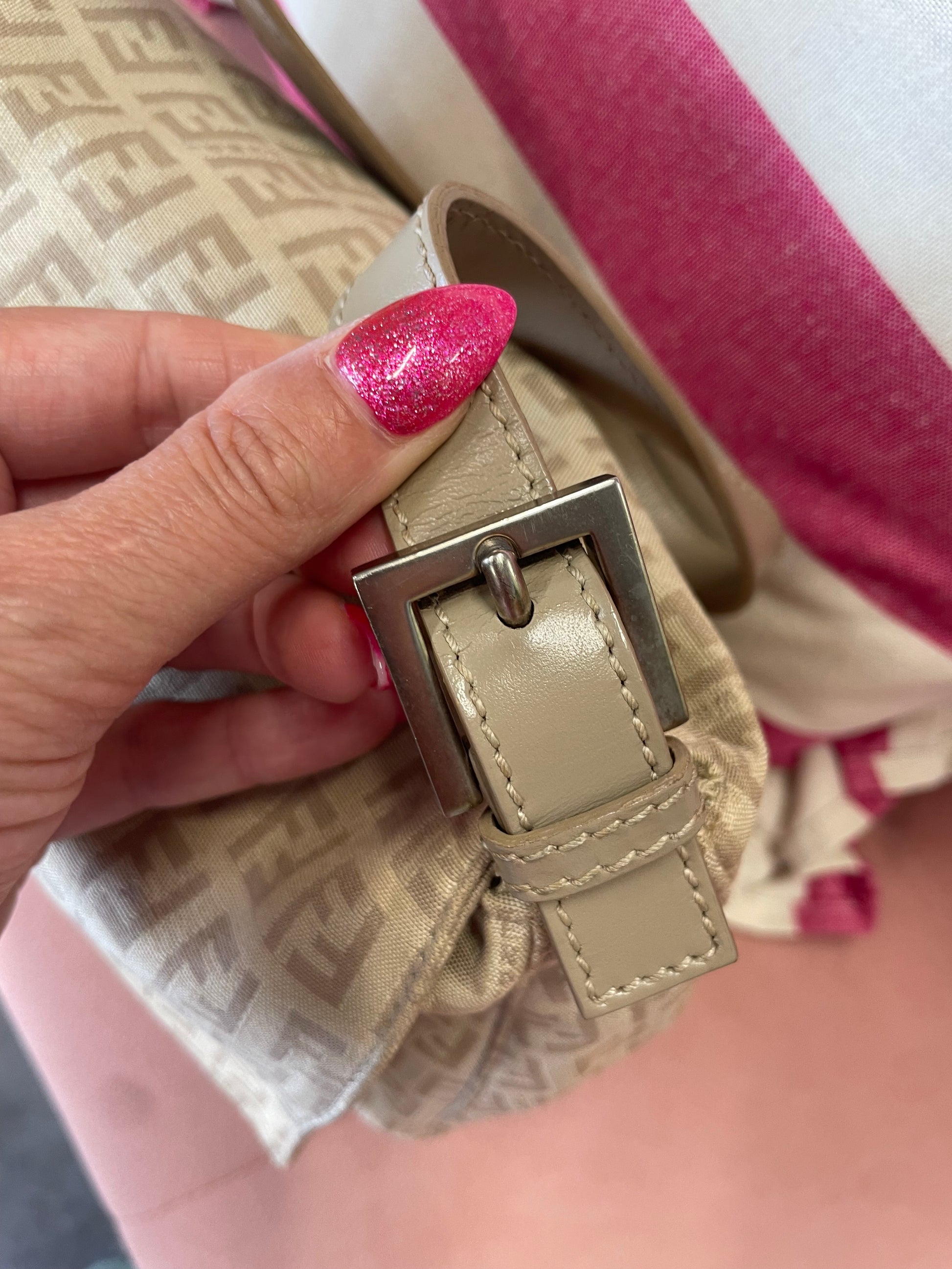 This Fendi Zucca Baguette Bag is an iconic staple from the Italian fashion house, instantly recognisable by its classic all-over FF monogram canvas and signature front flap with polished logo buckle. Finished in a soft beige and taupe palette with a matching adjustable leather shoulder strap, it’s the perfect neutral that complements any wardrobe.