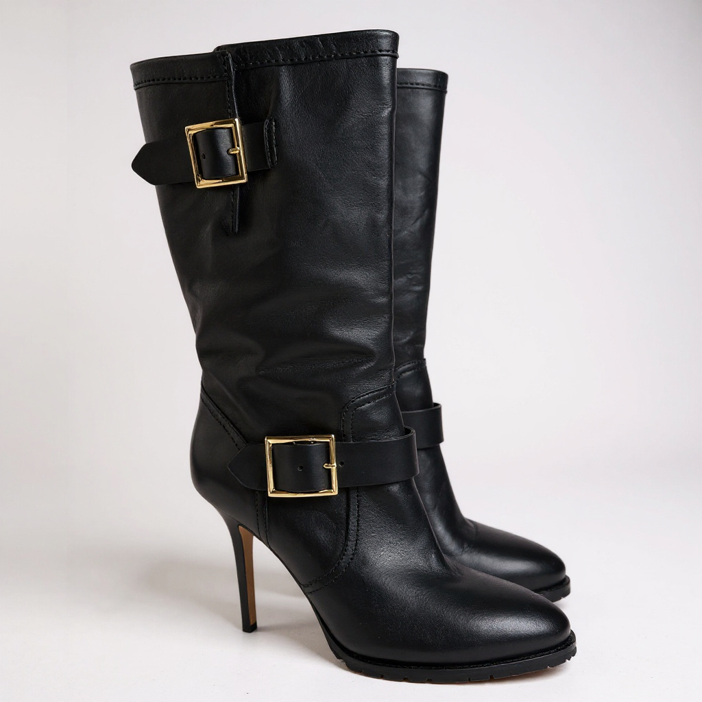 These Jimmy Choo boots in UK39 are in almost unused condition and come complete with the original box. Crafted from smooth black leather, they feature a mid-calf height, pointed toe, and slim stiletto heel for a sleek silhouette. Gold-tone buckle straps at the ankle and upper calf add a refined equestrian-inspired touch, making them a sophisticated choice for both day and evening wear.