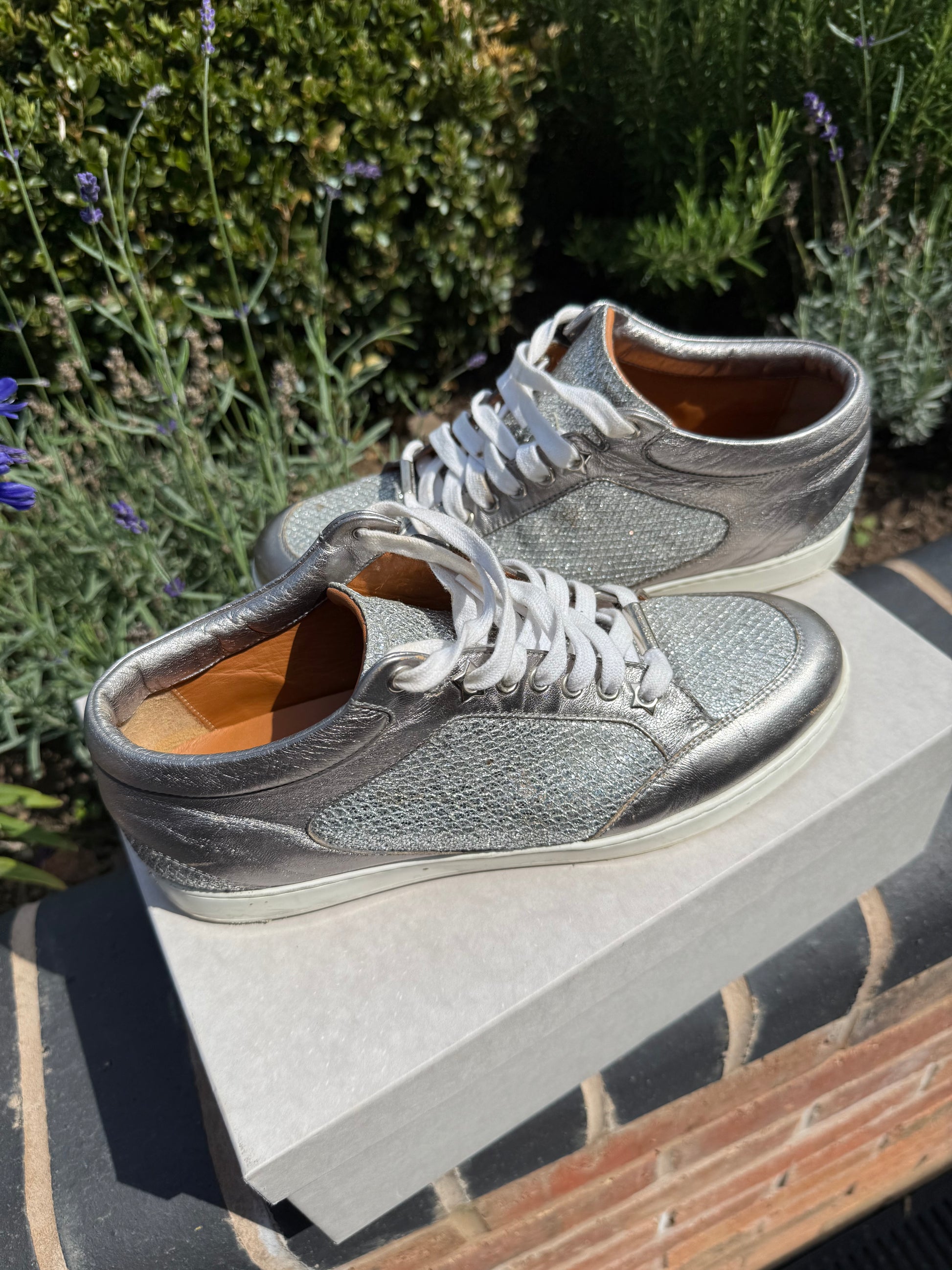 Jimmy Choo Miami Silver Low-Top Trainers – UK 39 – Good Preloved Condition