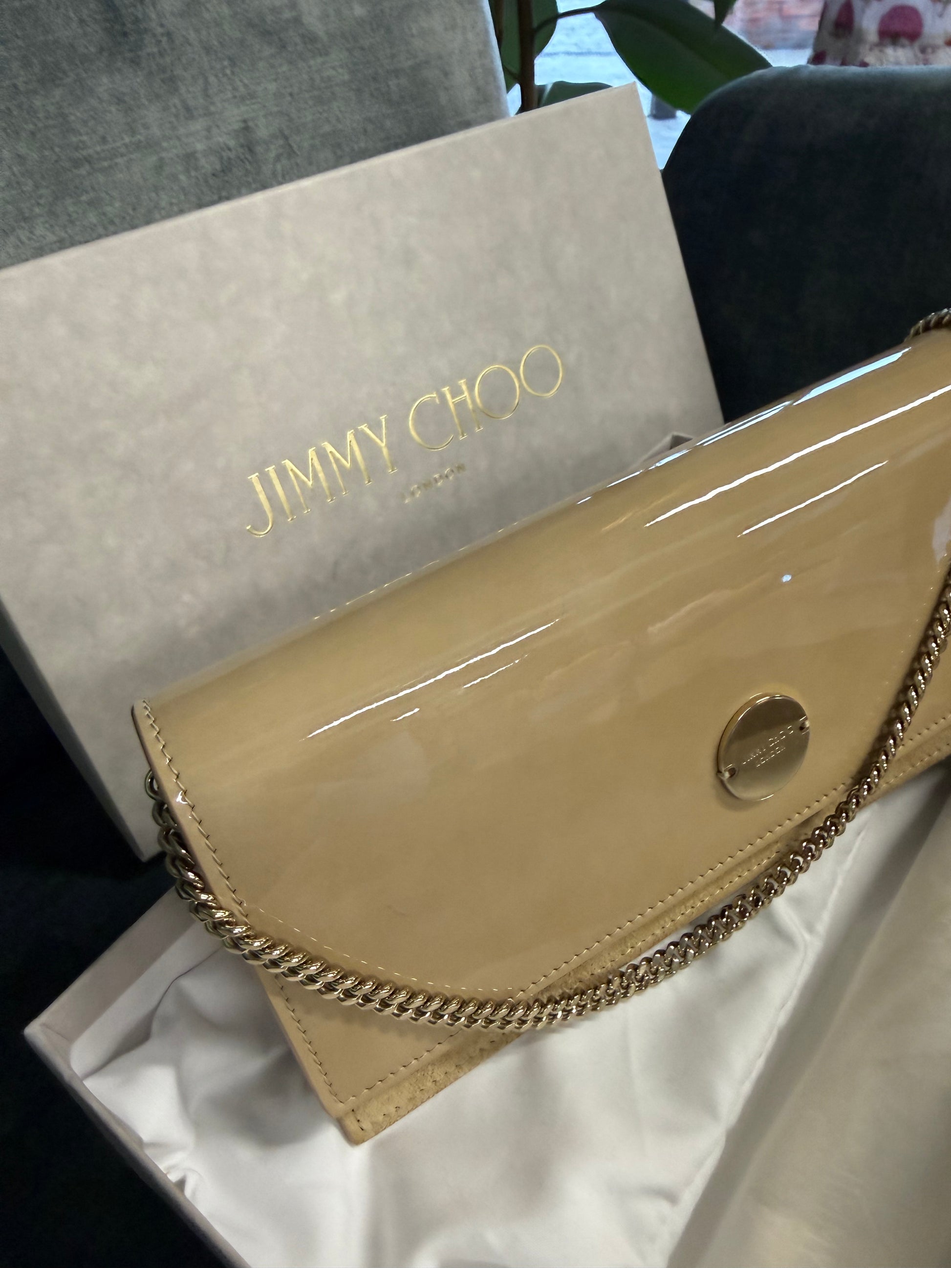 An elegant and timeless Jimmy Choo chain clutch in glossy nude patent leather — the perfect neutral piece for weddings, events, and evening occasions.