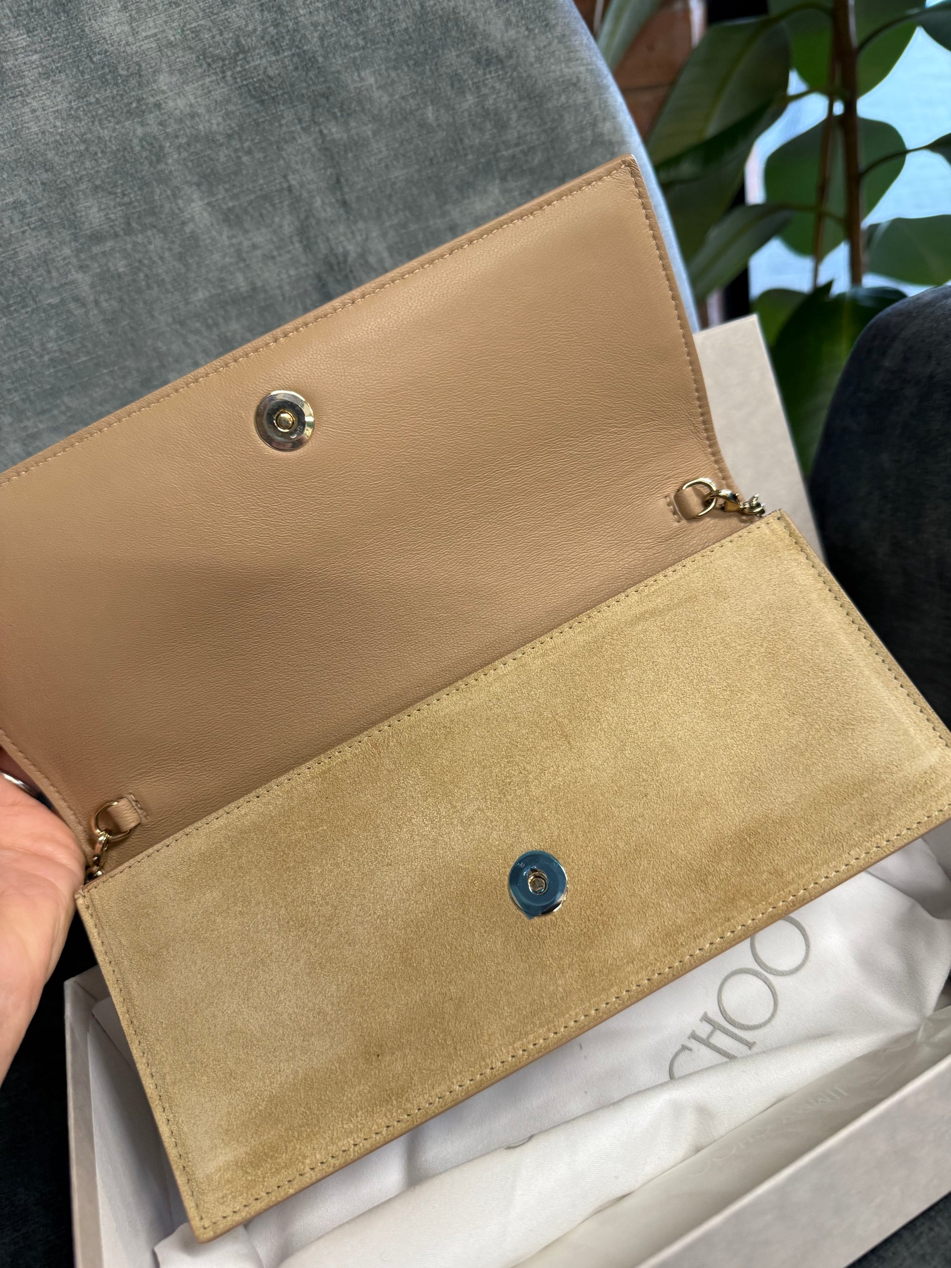 This sleek envelope-style design features a clean, structured silhouette with a front flap secured by Jimmy Choo’s signature round logo clasp. The soft nude tone pairs effortlessly with any outfit, while the delicate gold-tone chain strap allows the bag to be worn on the shoulder, crossbody, or carried as a clutch by tucking the chain inside.