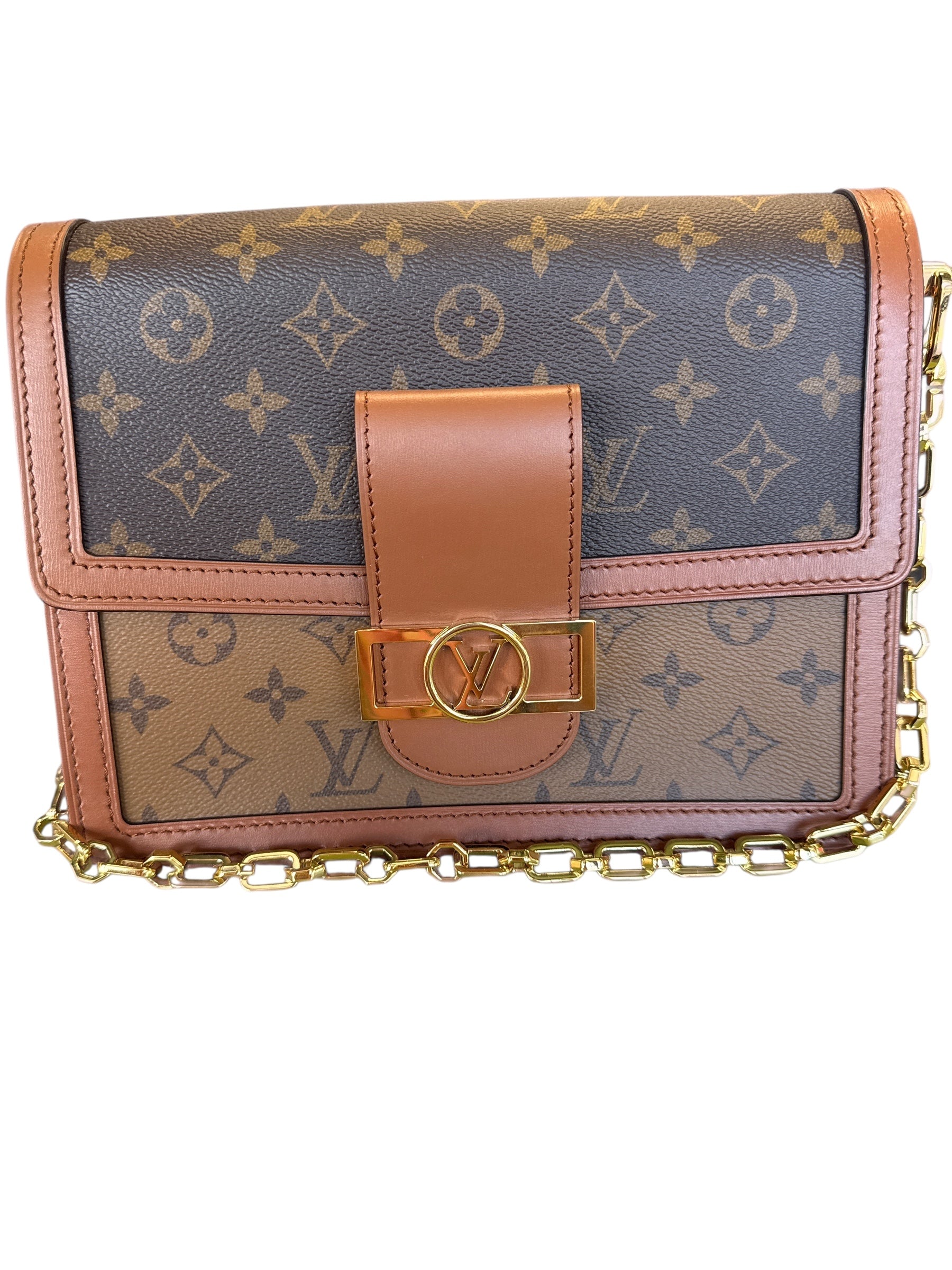 Elevate your collection with this stunning Louis Vuitton Dauphine MM, crafted in the iconic Monogram and Monogram Reverse canvas. A modern classic, this structured flap bag features a mix of signature prints, trimmed in smooth tan leather and finished with gleaming gold-tone hardware. The standout LV circle clasp adds a contemporary twist to this timeless piece.