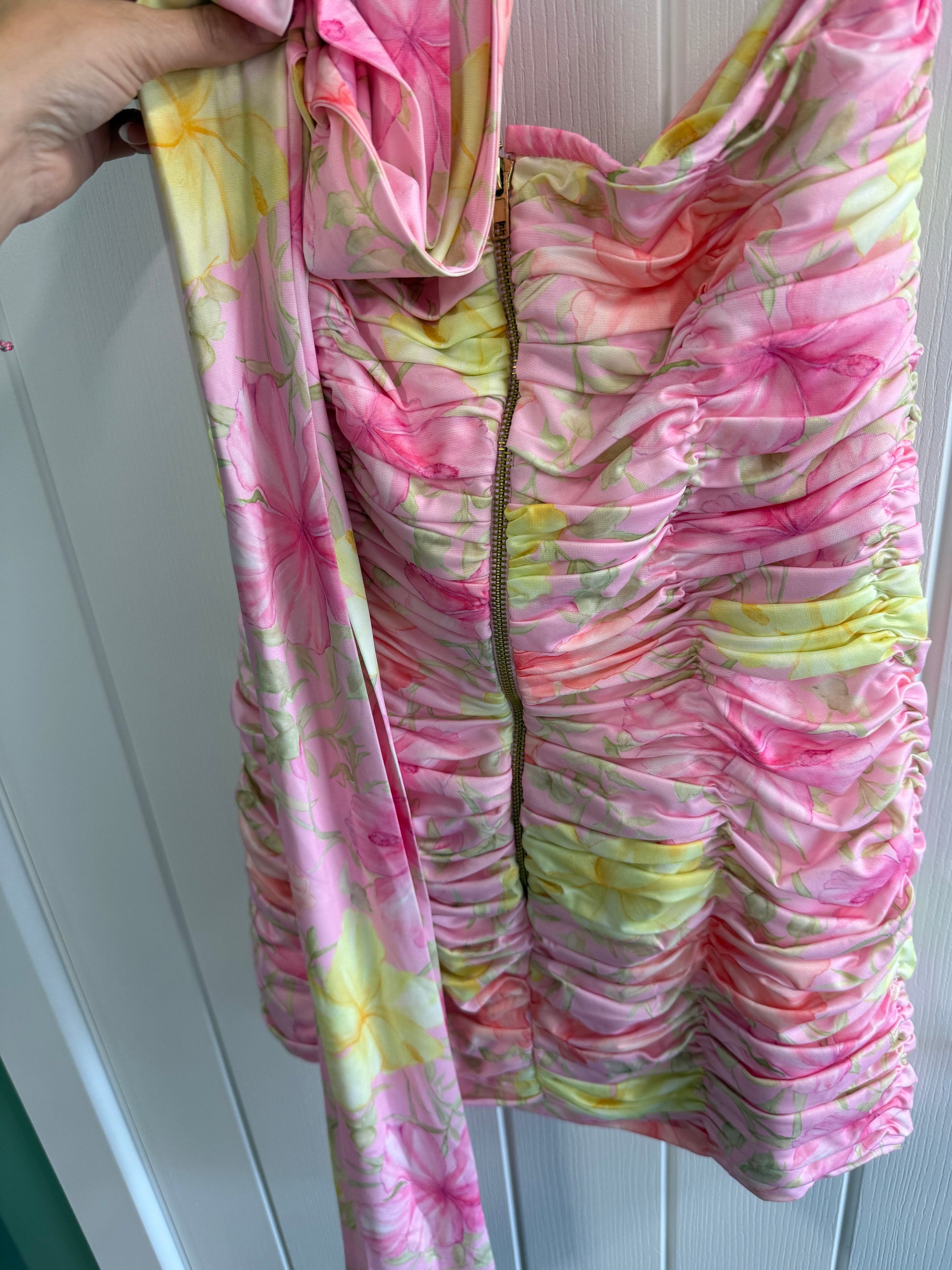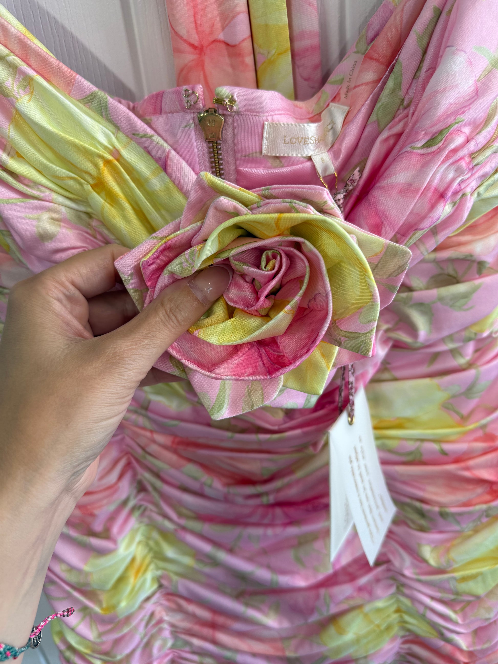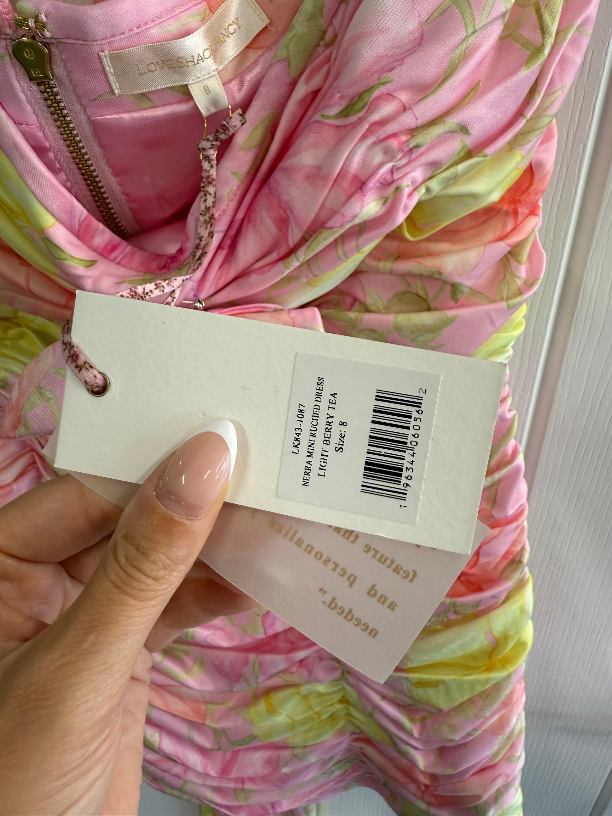 This LoveShackFancy dress in UK 8 is a show-stopping mini that radiates playful romance and ethereal charm. Crafted in a soft, sheer floral fabric in dreamy shades of pink, green, and yellow, the dress features all-over ruched detailing that hugs the figure and adds delicate texture throughout.