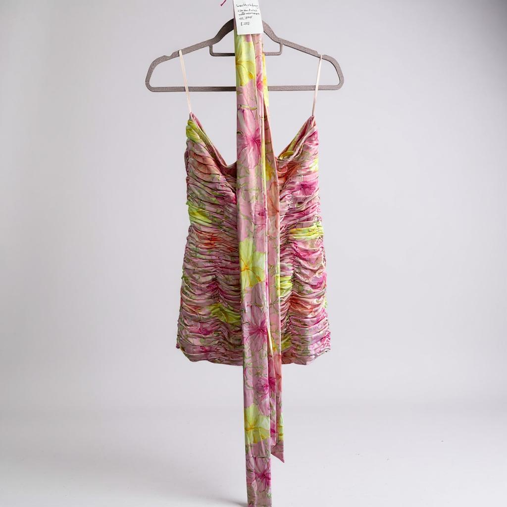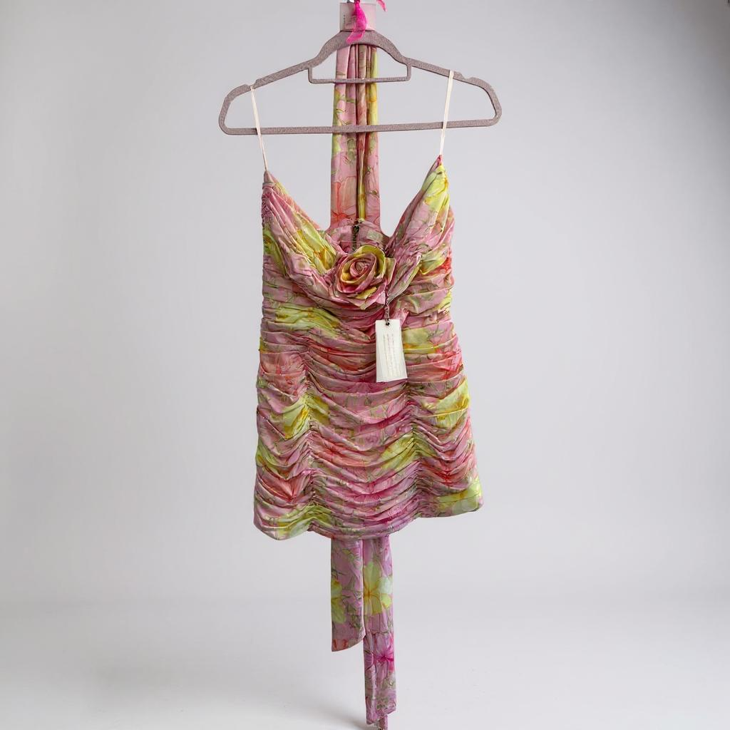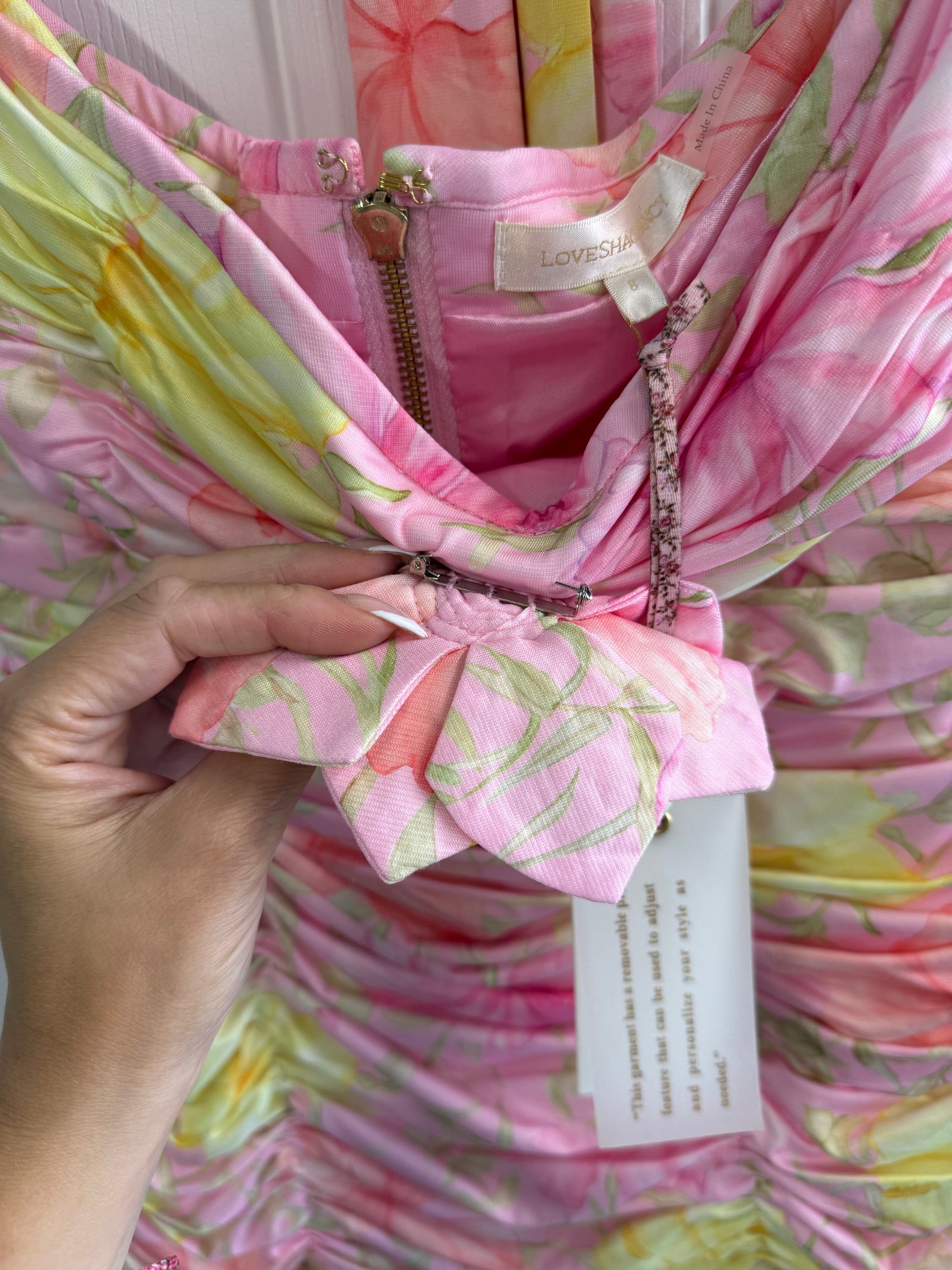 This LoveShackFancy dress in UK 8 is a show-stopping mini that radiates playful romance and ethereal charm. Crafted in a soft, sheer floral fabric in dreamy shades of pink, green, and yellow, the dress features all-over ruched detailing that hugs the figure and adds delicate texture throughout.