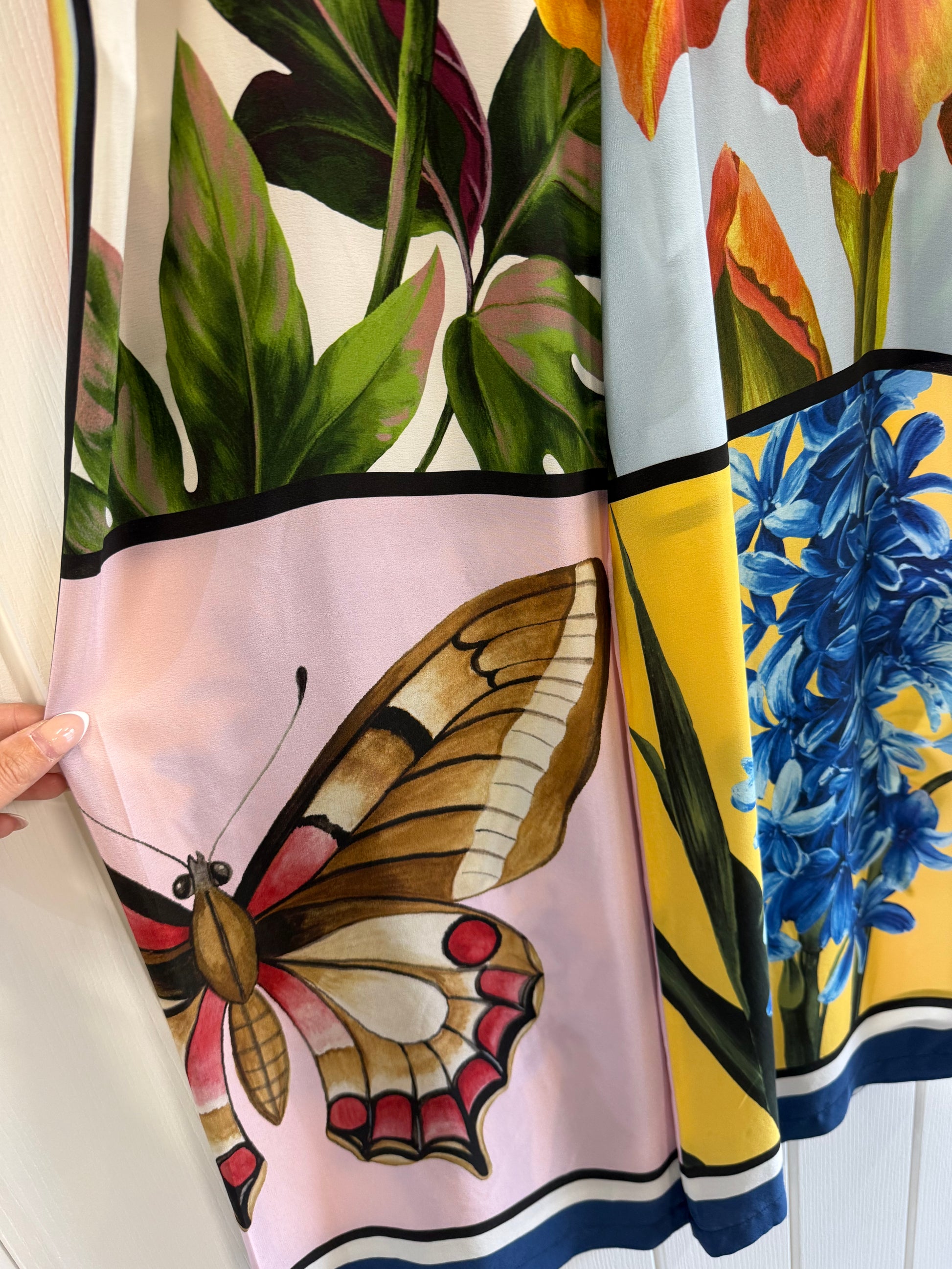 Max Mara wide-leg trousers in UK12, crafted from a silky fabric adorned with a bold botanical and butterfly print in vibrant shades of yellow, blue, pink, and green. Designed with an elasticated waistband for comfort and a flowing drape for effortless elegance. A statement piece perfect for adding colour and sophistication to warm-weather dressing. RRP £260. Excellent preloved condition.