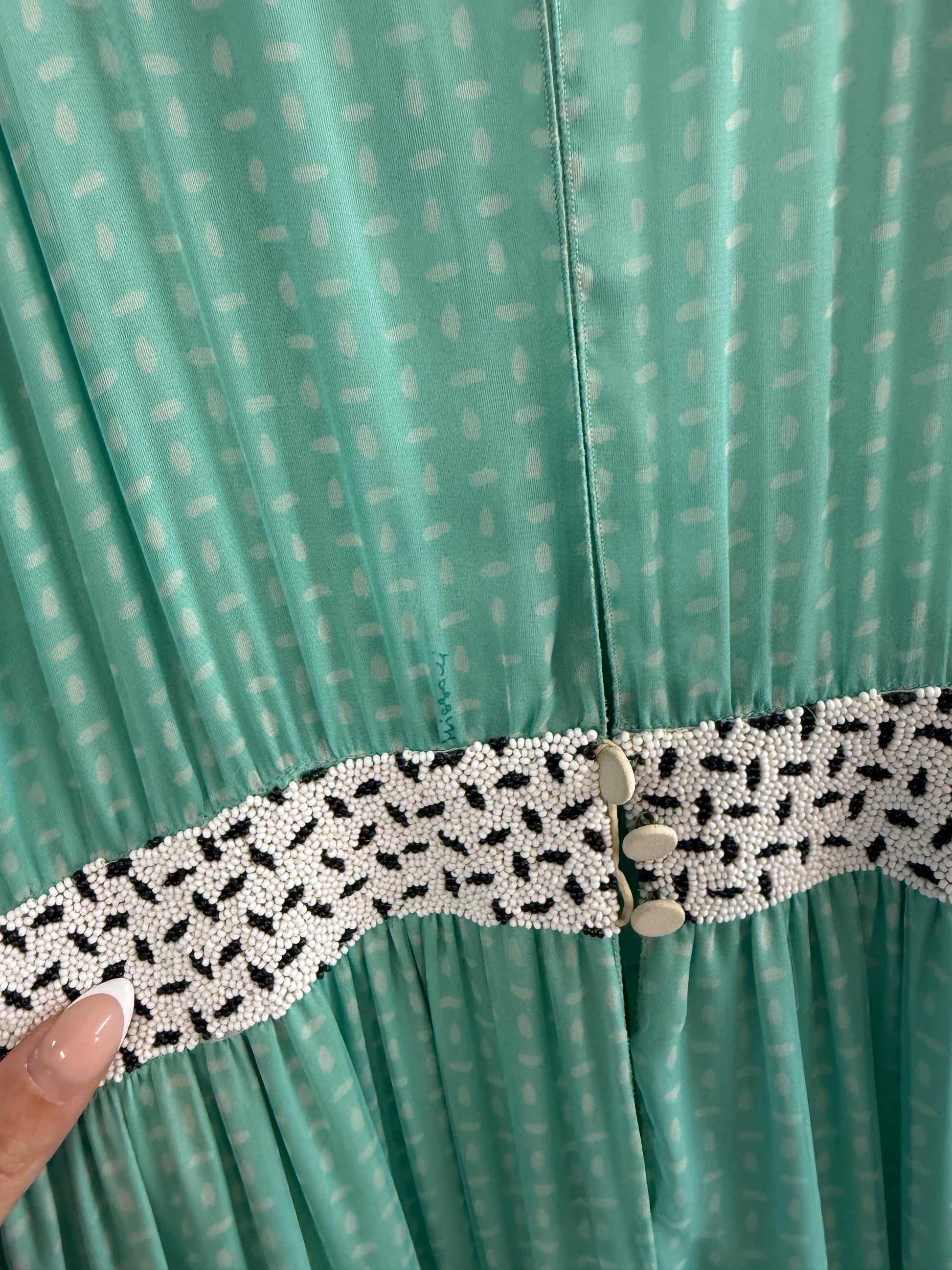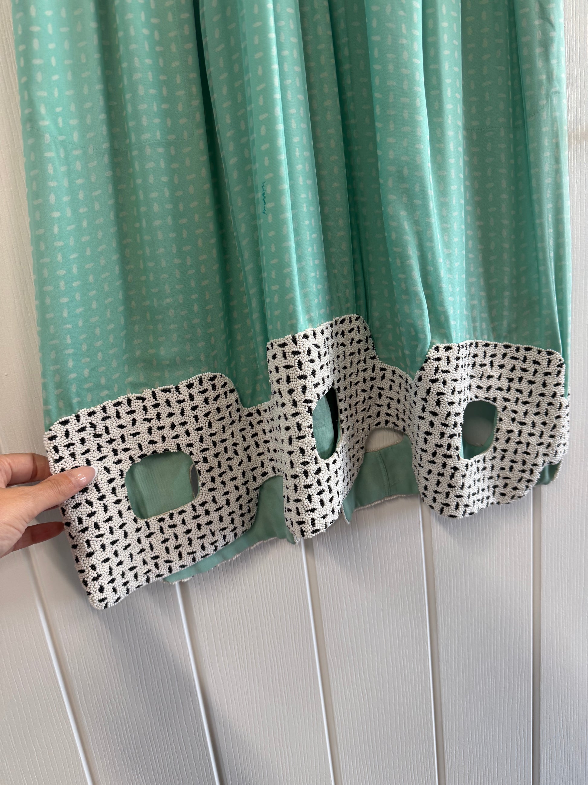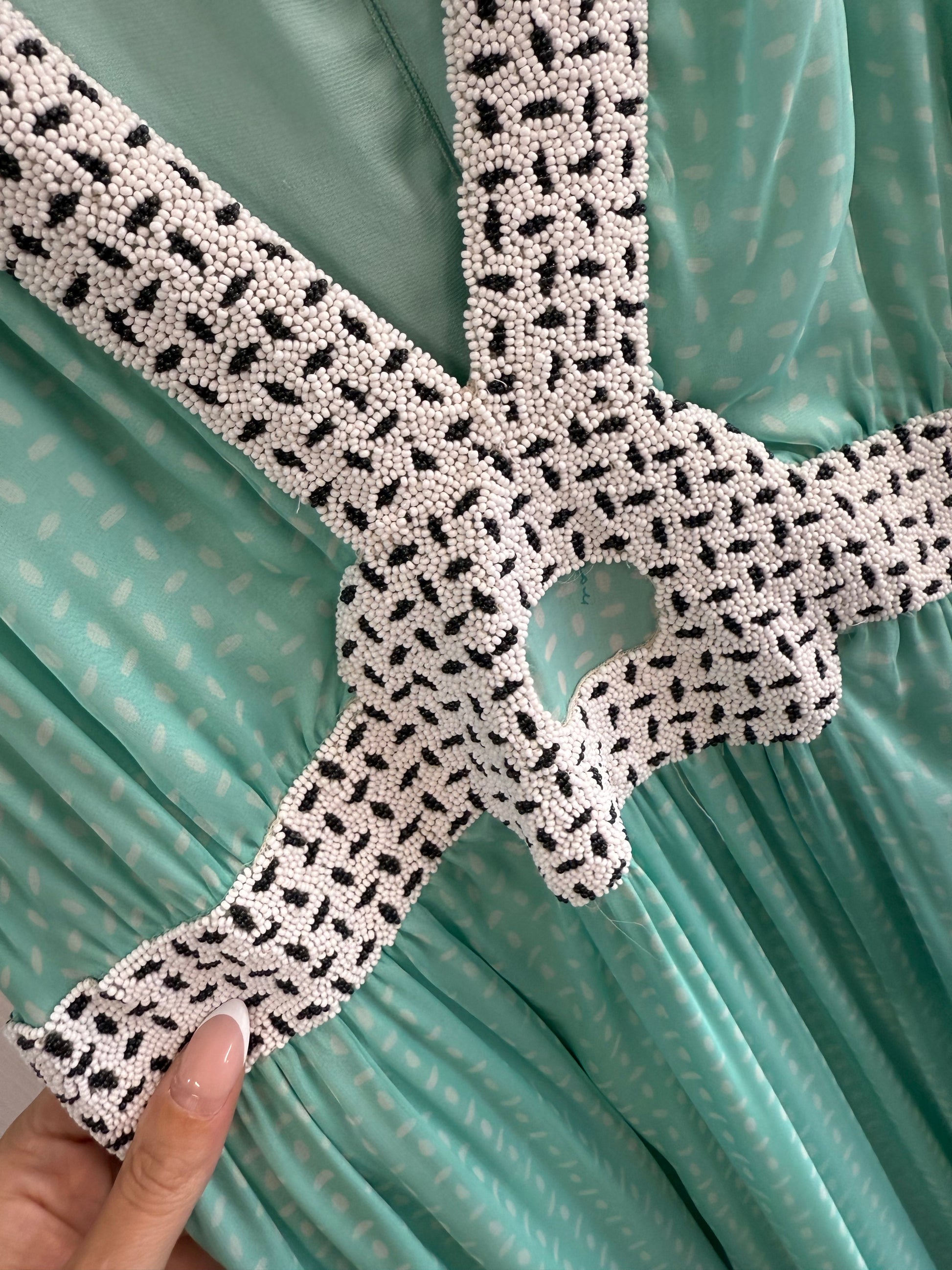 This striking dress by Missoni in UK 8 features a unique vintage-inspired design in a soft mint green hue. It is beautifully accented with intricate black and white geometric trim along the structured shoulders, plunging V-neckline, waistband, and hemline. The empire waist and softly gathered skirt create a flattering, fluid silhouette, while a central keyhole cut-out at the waist adds a modern touch. A standout piece ideal for summer occasions or destination events.