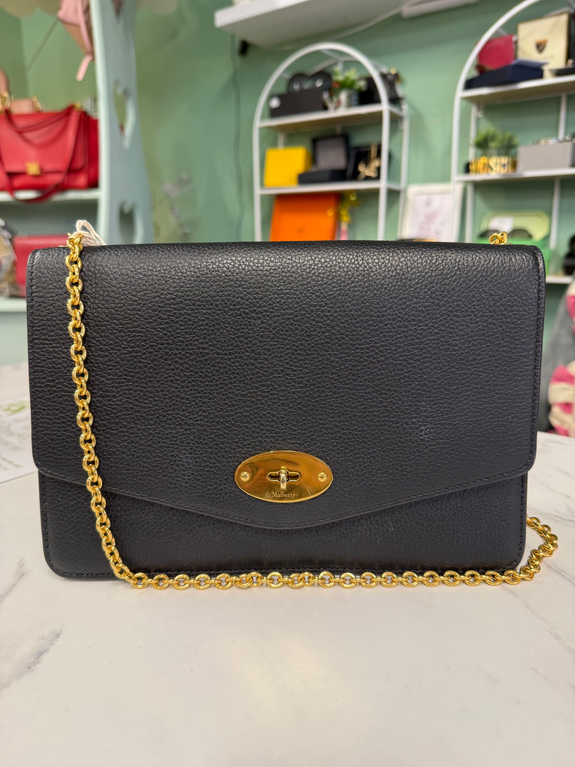 A timeless Mulberry classic, the Darley Medium is crafted from luxurious black grained leather and finished with the iconic postman’s lock in gold-tone hardware. Elegant yet practical, it can be worn crossbody or carried as a clutch, making it perfect for both day and evening wear.