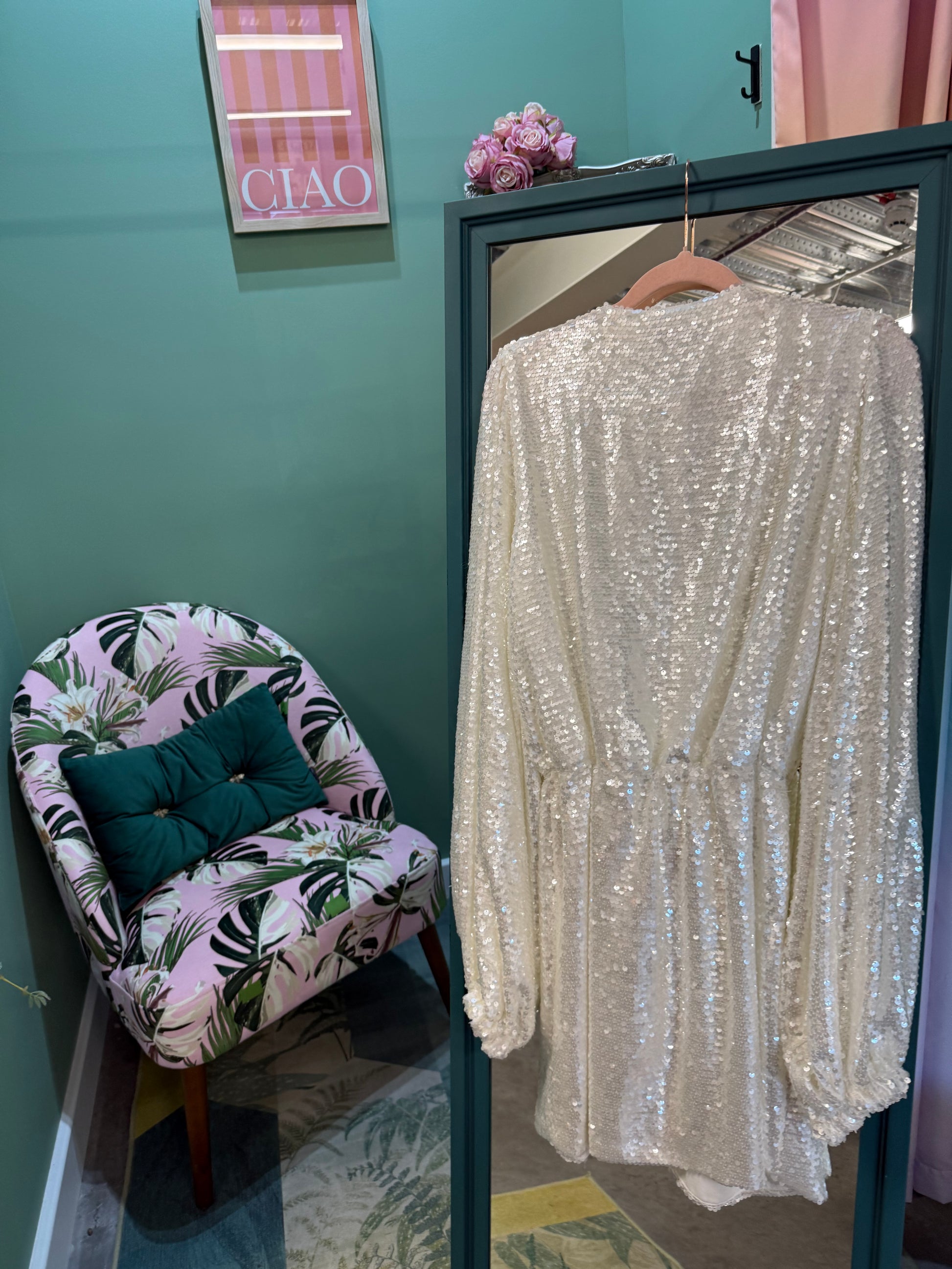 • Fully sequin-embellished silver fabric