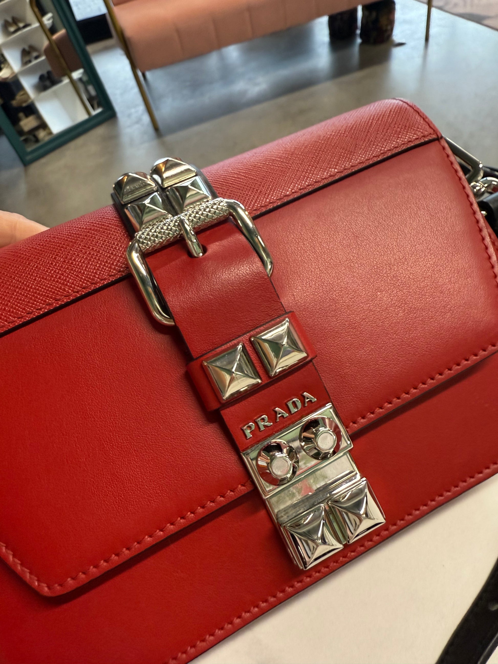 Prada Cahier Studded Shoulder Bag – Red Saffiano Leather