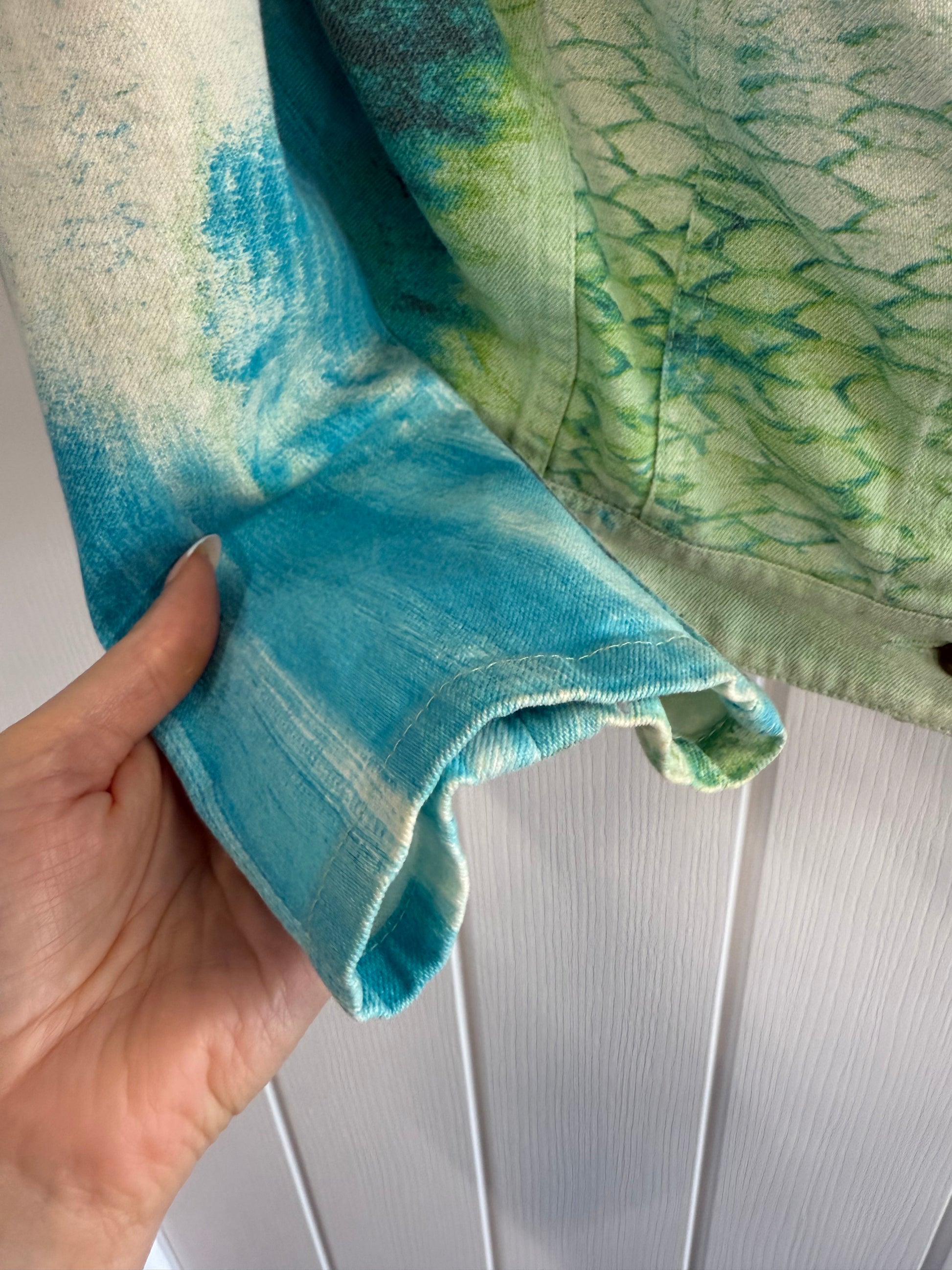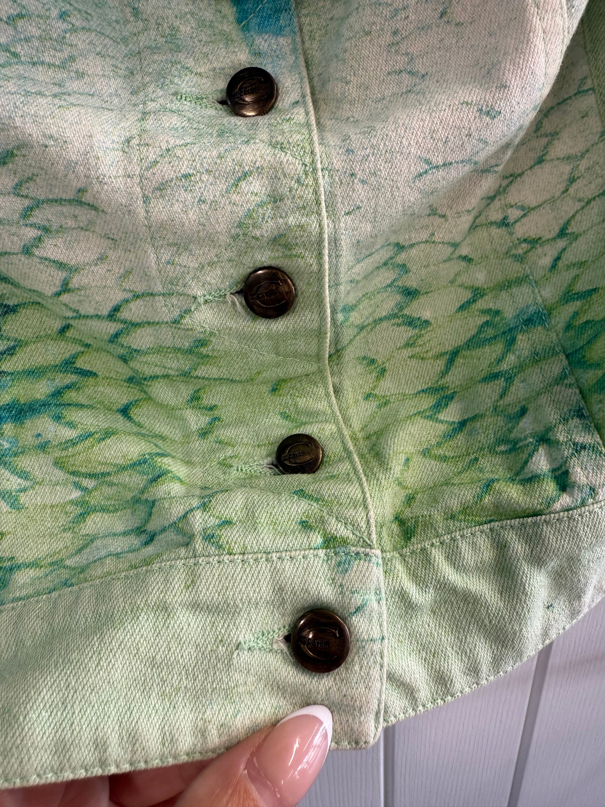 This Roberto Cavalli jacket in UK 10 is a striking piece that captures the brand’s signature flair for bold prints and sensual tailoring. Crafted in a soft denim-like fabric, it features a vivid snake-print pattern in a fresh palette of green, aqua, and ivory, fading into vibrant turquoise sleeves for an ombré effect.