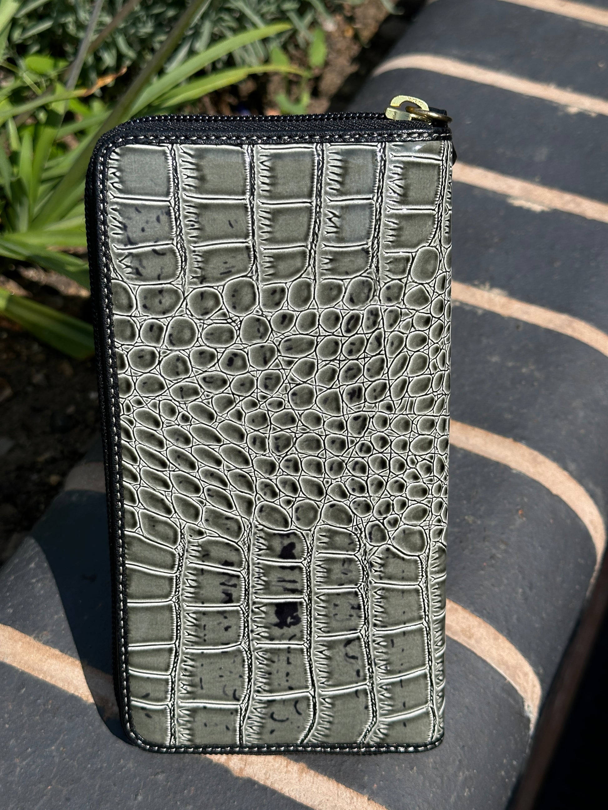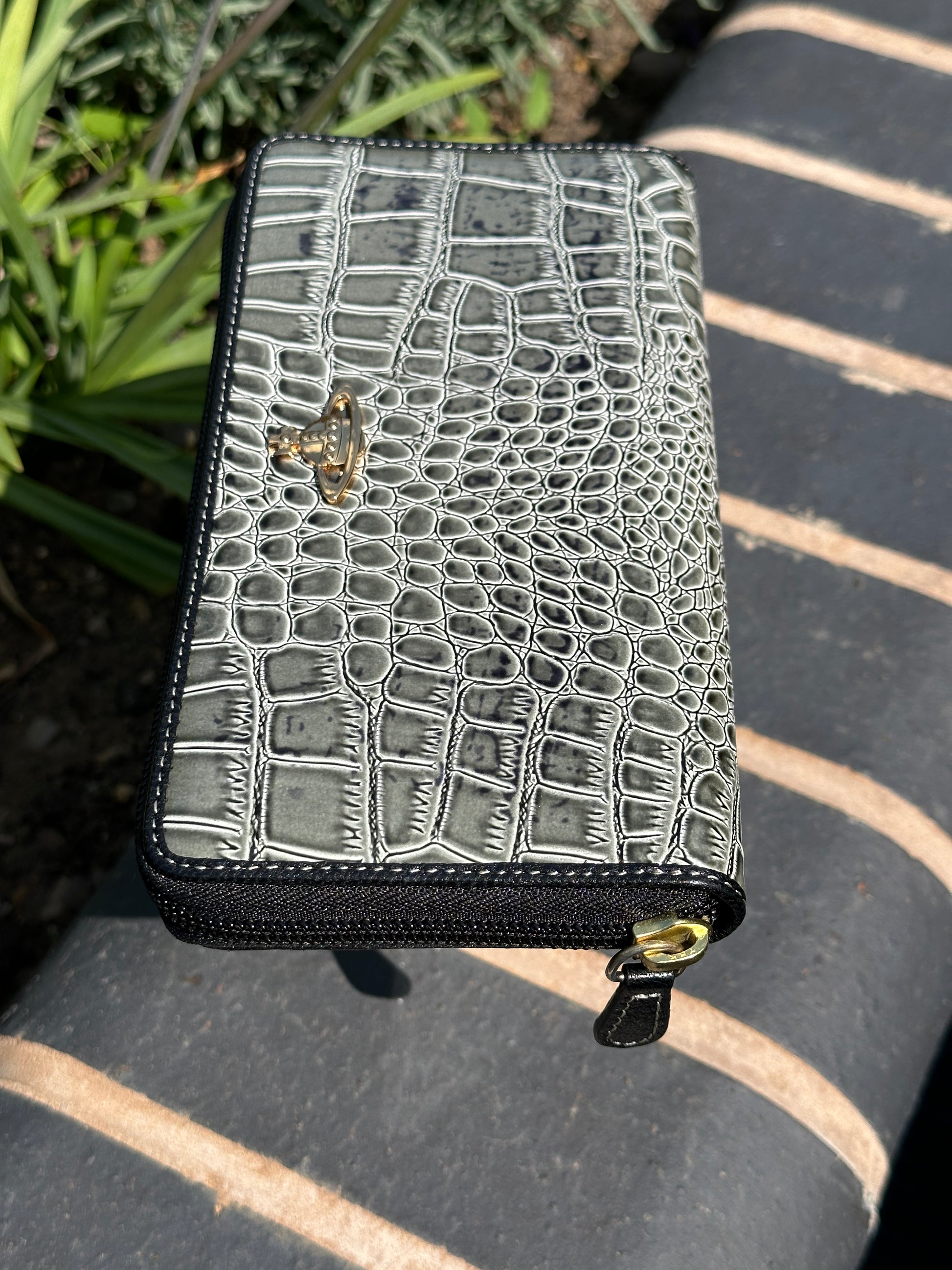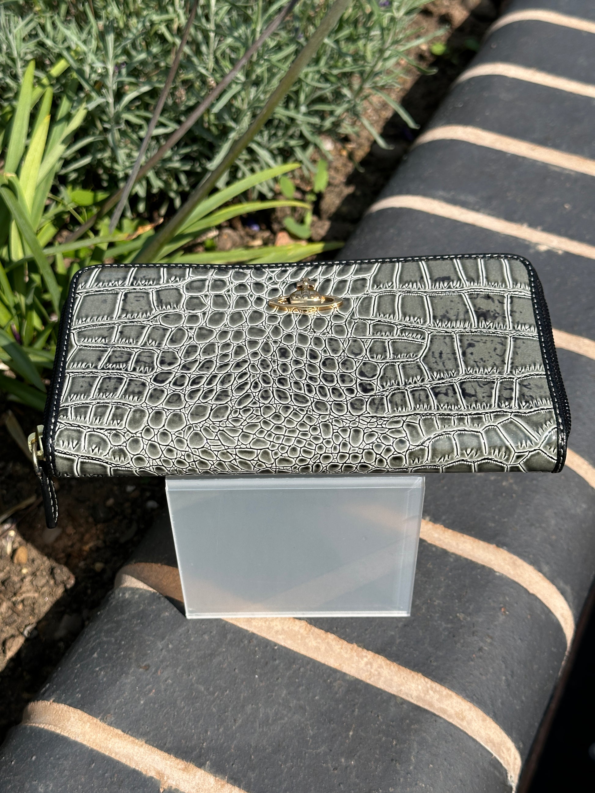Vivienne Westwood zip-around purse in olive green, crafted in a croc-embossed finish for a luxurious texture. Featuring the iconic gold-tone Orb emblem to the front, this statement accessory offers both style and practicality. Comes complete with its original box.